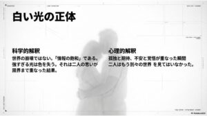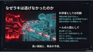 レセプターが引き起こした「危機の正体」は、現実に迫っていた物理的な危険ではありません。レイがレセプターを作動させた影響によって、ラキが進めている粒子加速器の測定結果に「揺らぎ」が生じたことが発端でした。ラキ自身はその測定結果に対する疑問や不安を冷静に捉えていましたが、レセプターを通じてその不安が増幅されてレイに伝わってしまったのです。その結果、レイが「ラキに大きな危険が迫っている」と誤認したのが危機の真相だったのですが・・・